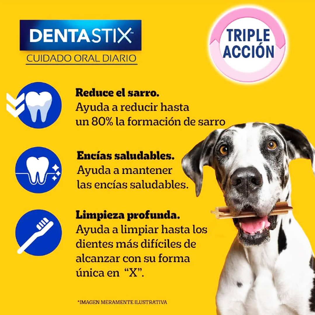 PEDIGREE® DENTASTIX™ es una barra de cuidado oral que, usada diariamente, ayuda a reducir la formación de sarro en los perros. Gracias a su forma exclusiva y a su combinación de ingredientes activos, es una solución efectiva para mantener dientes limpios y encías saludables de forma fácil y divertida.